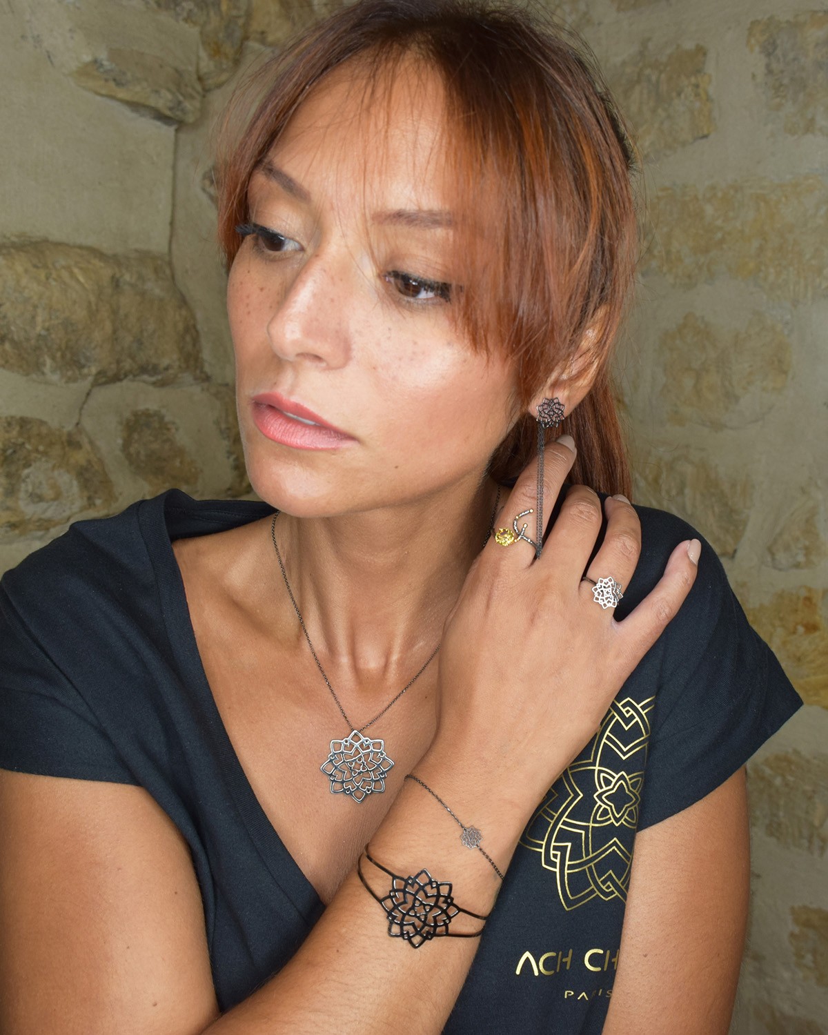 A rosette which makes us travel towards multiple universes, the arched doors forming the "A" in the logo ACH CHAJAI PARIS, are linked and intertwined representing a seal of authenticity, an invitation to discover various cultures, representing the Woman with plural origins and proud to be.