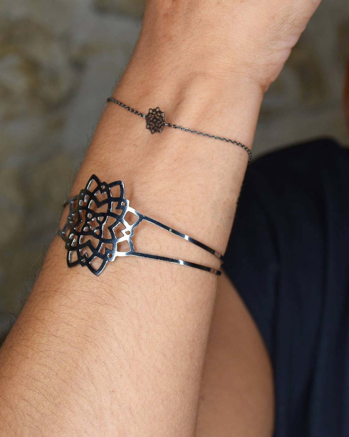 Manchette ajustable, elle fait partie de notre collection Éco-responsable "ORIGINES" à l'effigie de notre emblème la rosace, le diametre de la rosace fait 3,5 cm